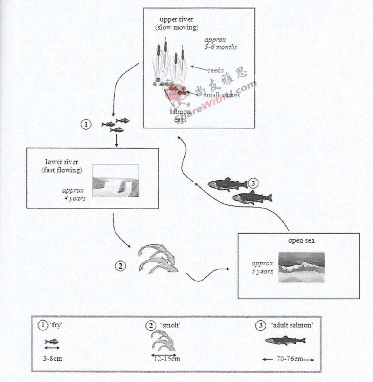 The diagrams below show the life cycle of a speicies of large fish called the salmon.