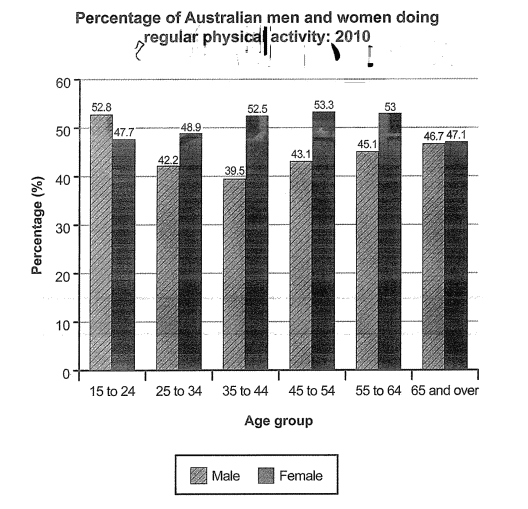 The bar chart below highlights information about the percentage of Australian male and female participating in physical activities in different age groups in 2010.