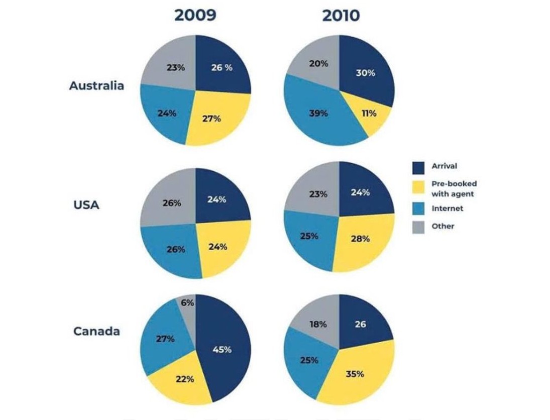 The pie charts below show the methods used by international students when booking online English courses in three different countries in 2009 and 2010.