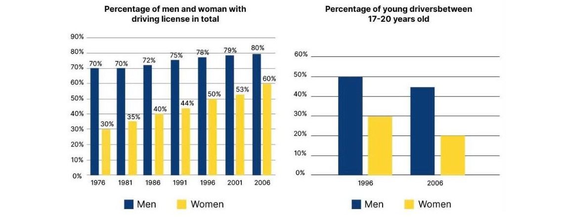 The charts give information about the percentage of men and women who had driving licences in one European country in various years.