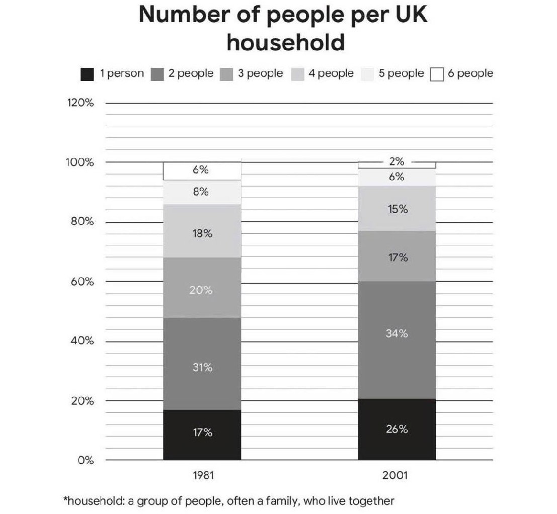 The chart below compares the number of people per household* by percentage in the UK in 1981 and 2001.