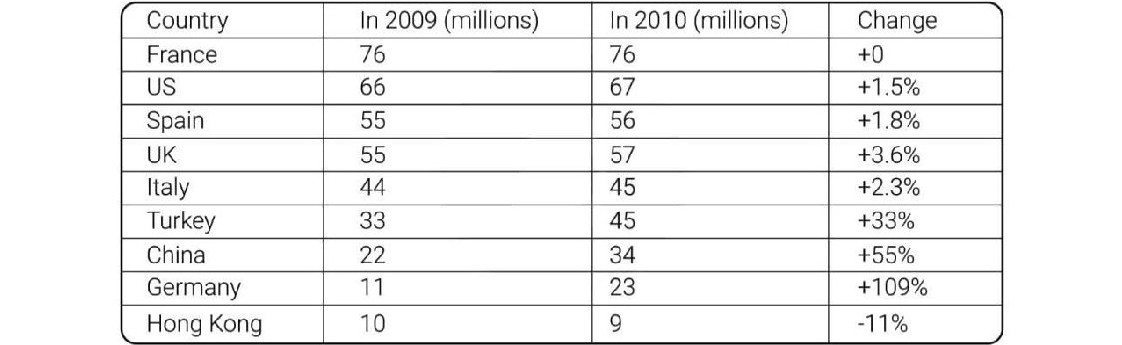 Table the table below show the number of international tourists in 9 top countries in 2009 and 2010.