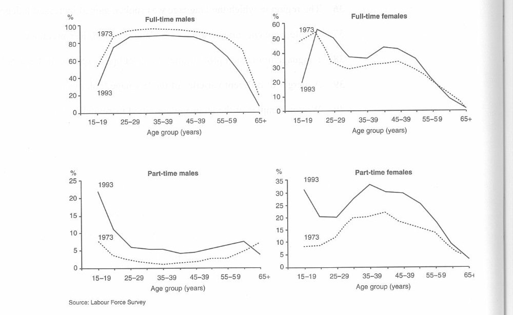 The graphs below show the number of men and women in full and part-time employment in Australia between 1973 and 1993.