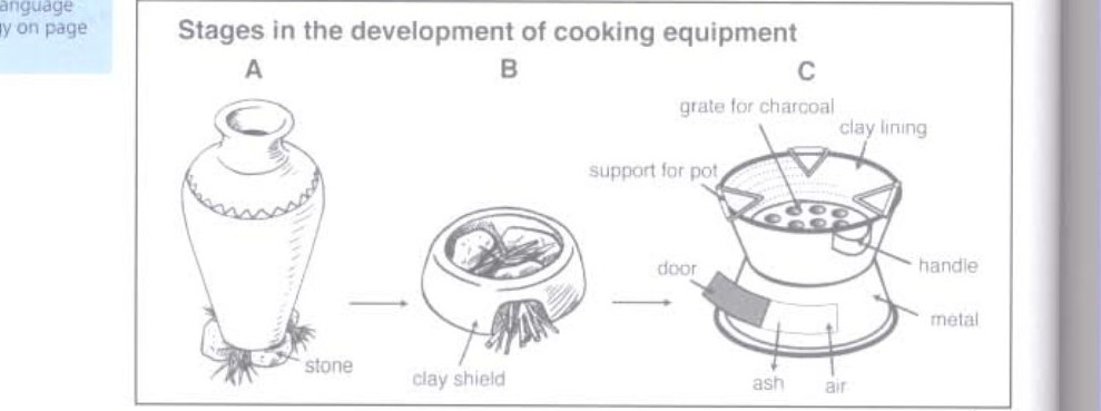 The diagrams below show stages in the development of simple cooking equipment.
