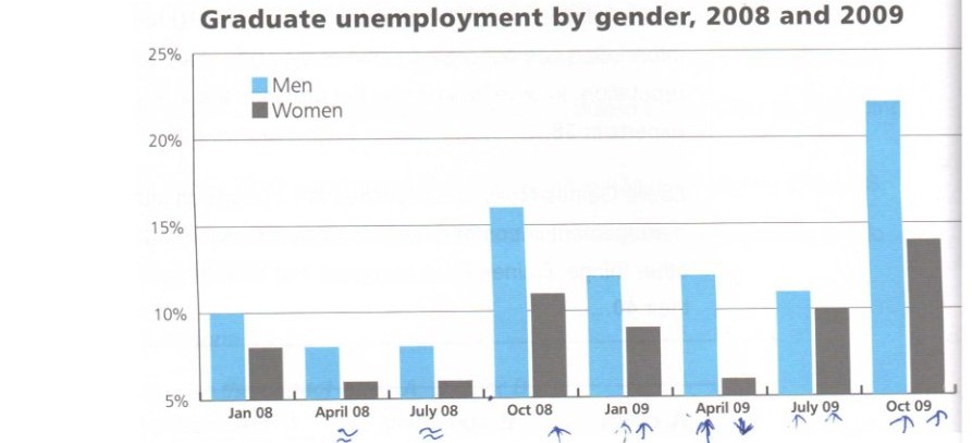 The bar chart below shows the percentage of unemployed graduates, aged 20-24, in one European country over a two-year period.