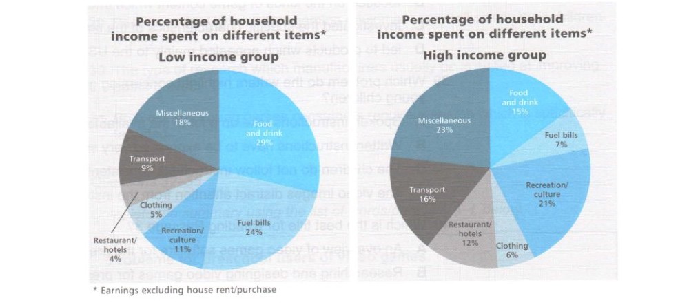 The charts below show the percentage of monthly household income spent on various items by two different groups in one European country.