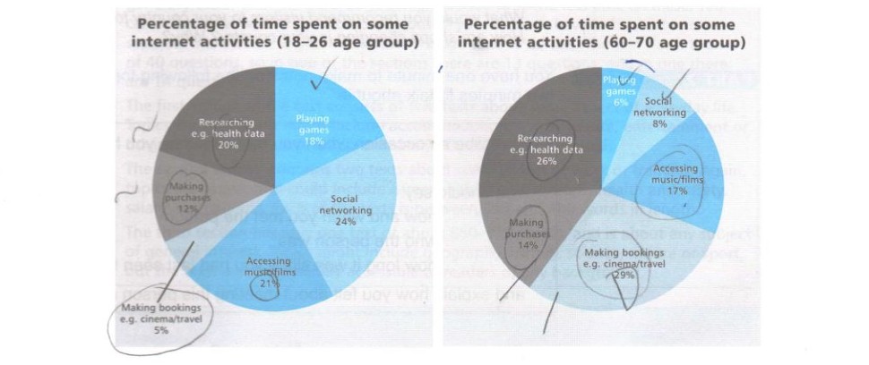 The charts below show the percentage of time younger and older people spend on various Internet activities in their free time (excluding email).