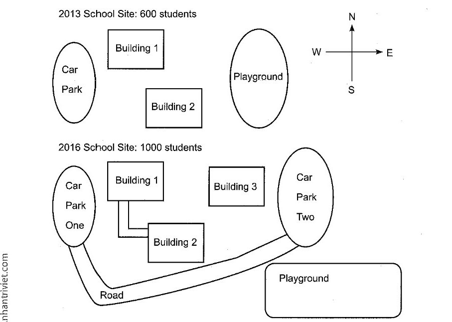 The maps below show the site of a school in 2013 and the planned one in 2016. Summarise the information by selecting and reporting the main features, and make comparisons where relevant.