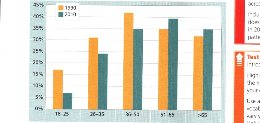 The chart below gives information on the percentage of British people giving money to charity by age range for the years 1990 and 2010.