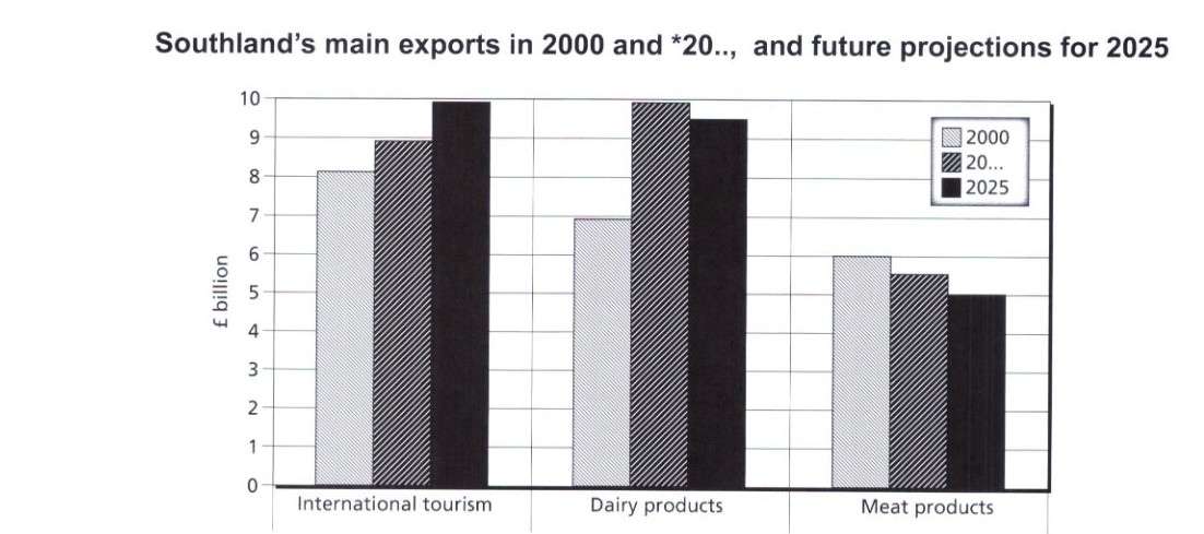 The chart below gives information about Southland's main exports in 2000, *20.., and future projections for 2025.